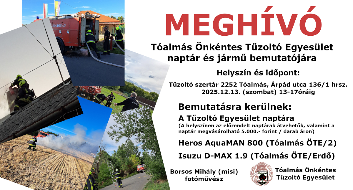 Ezt a weboldalt azért hoztuk létre, hogy a Tóalmás Önkéntes Tűzoltó Egyesület munkássága iránt érdeklődőknek interaktívabban tudjuk bemutatni tevékenységünket, bevetéseinket, a falut és lakosait érintő eseményeket.